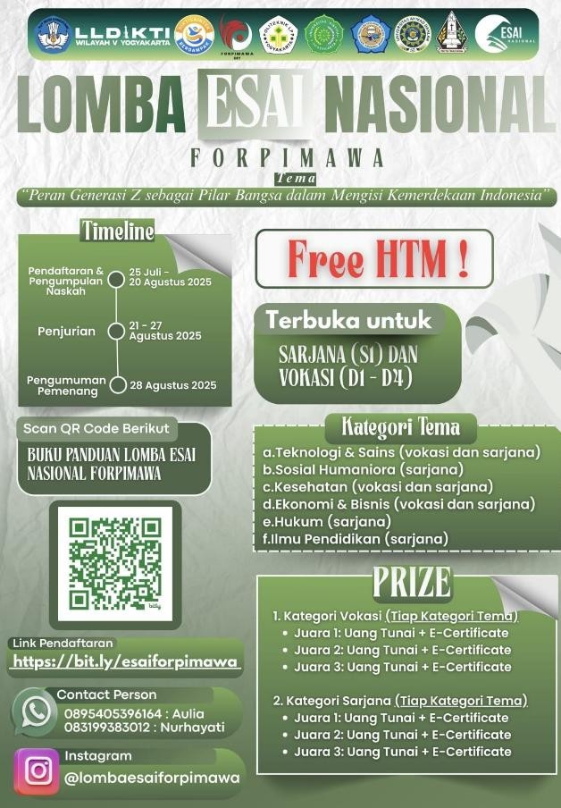 Bersama ini kami informasikan kepada perguruan tinggi di lingkungan Lembaga Layanan Pendidikan Tinggi Wilayah III mengenai kegiatan Lomba Esai Nasional FORPIMAWA 2025 dalam rangka memperingati HUT Kemerdekaan Republik Indonesia ke-80. Kegiatan ini diselenggarakan oleh Forum Pimpinan Perguruan Tinggi Bidang Kemahasiswaan (Forpimawa) Daerah Istimewa Yogyakarta. Lomba ini terbuka bagi seluruh mahasiswa jenjang Sarjana (S1) dan Vokasi (D1–D4) di Indonesia tanpa dipungut biaya. Waktu pelaksanaan lomba adalah sebagai berikut: