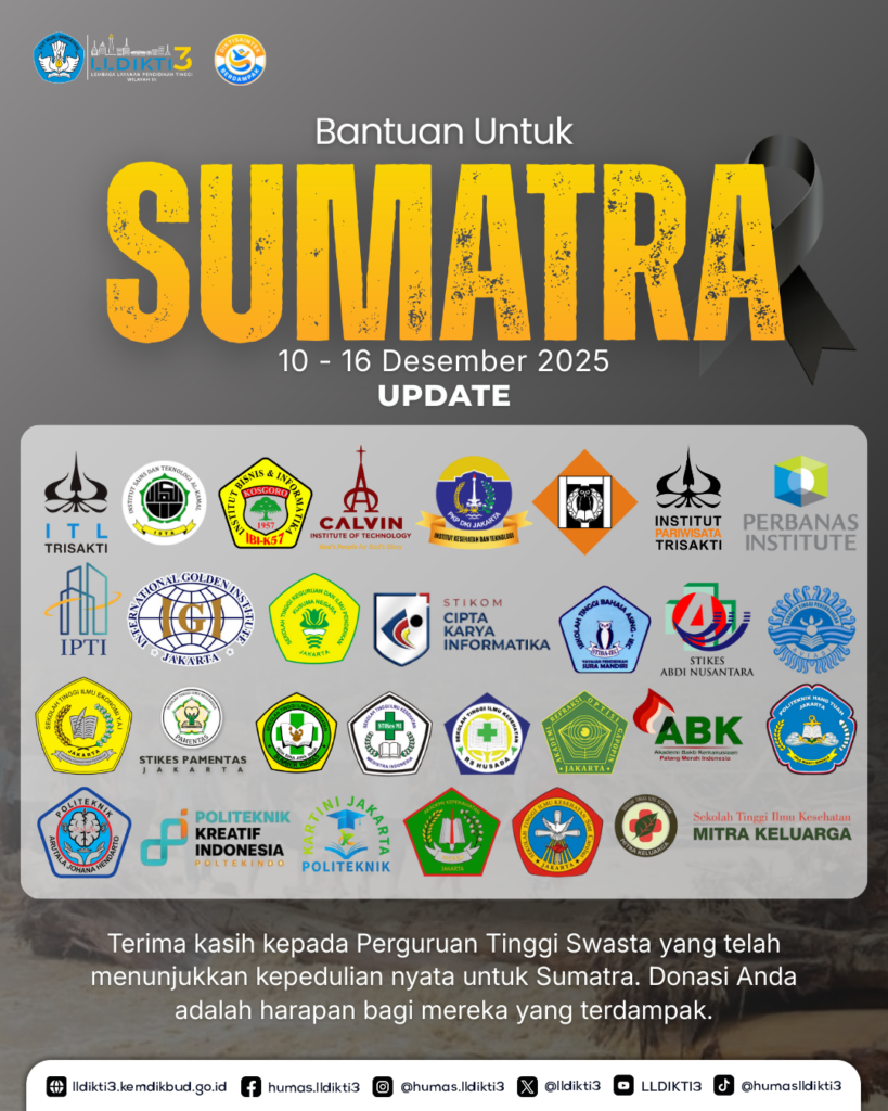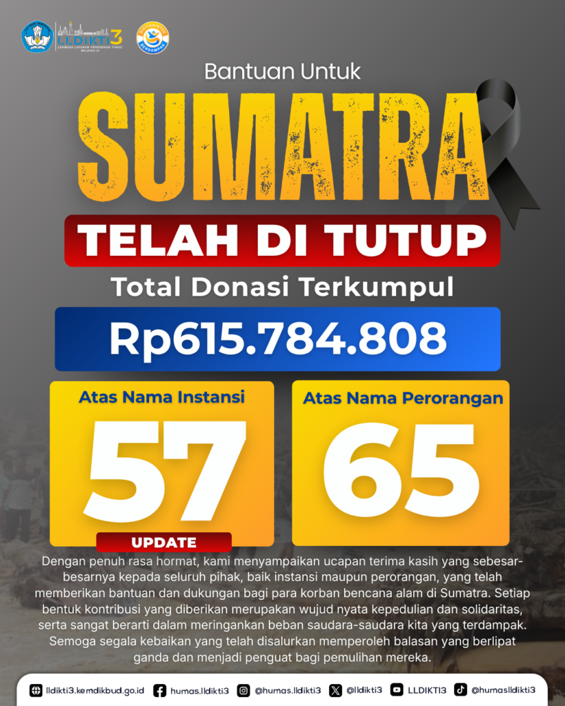 Keluarga besar LLDikti Wilayah III menyampaikan apresiasi yang sebesar-besarnya kepada seluruh pihak yang telah berkontribusi dalam penggalangan dana bantuan untuk Sumatra.